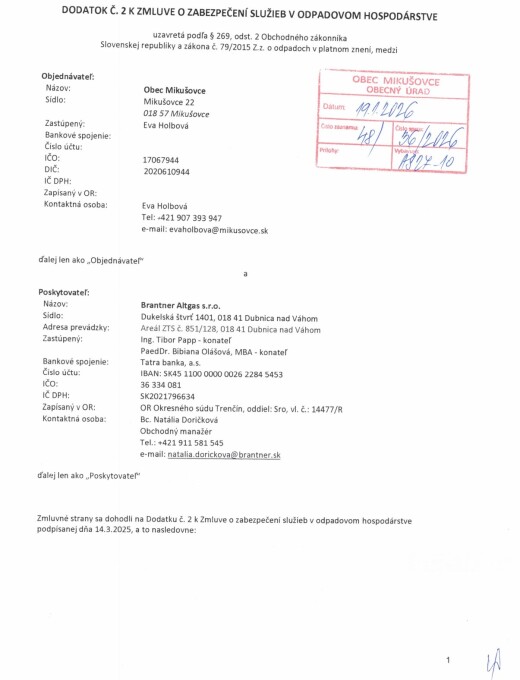 | Predmet zmluvy | Dodatok č. 2 k Zmluve o zabezpečení služieb v odpadovom hospodárstve |