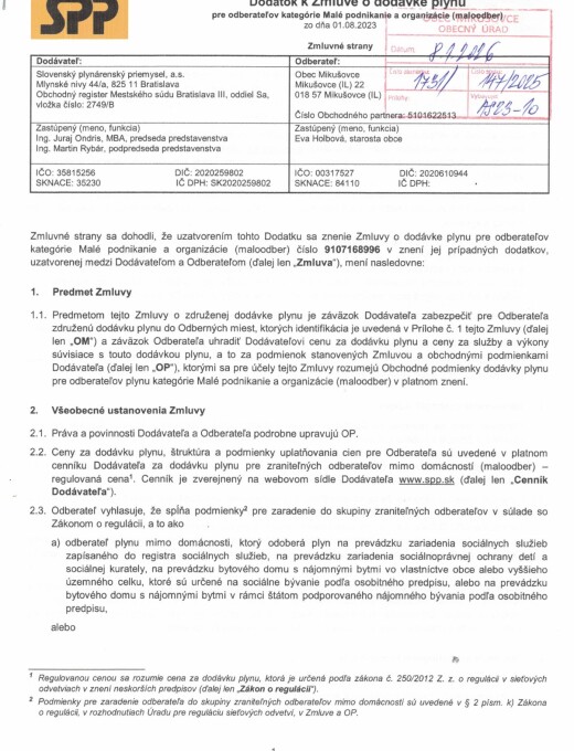 Číslo zmluvy Dodatok k Zmluve o dodávke plynu