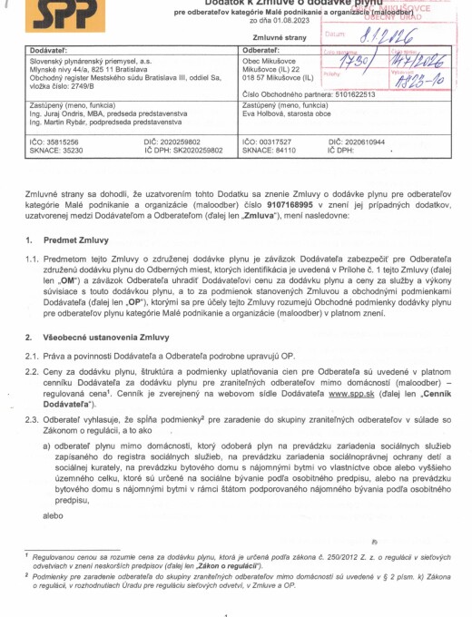 | Názov zmluvy | Dodatok k Zmluve o dodávke plynu |