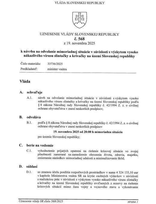 Na základe Uznesenia vlády Slovenskej republiky č. 568 z 19. novembra 2025 bola dňa 19. novembra 2025 k 20:00 hod. odvolaná mimoriadna situácia vyhlásená v súvislosti s výskytom vysoko nákazlivého vírusu slintačky a krívačky na území Slovenskej republiky.