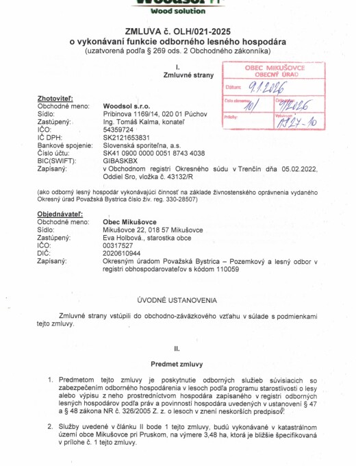 | Názov zmluvy | Zmluva č. OLH/021-2025 o vykonávaní funkcie odborného lesného hospodára |