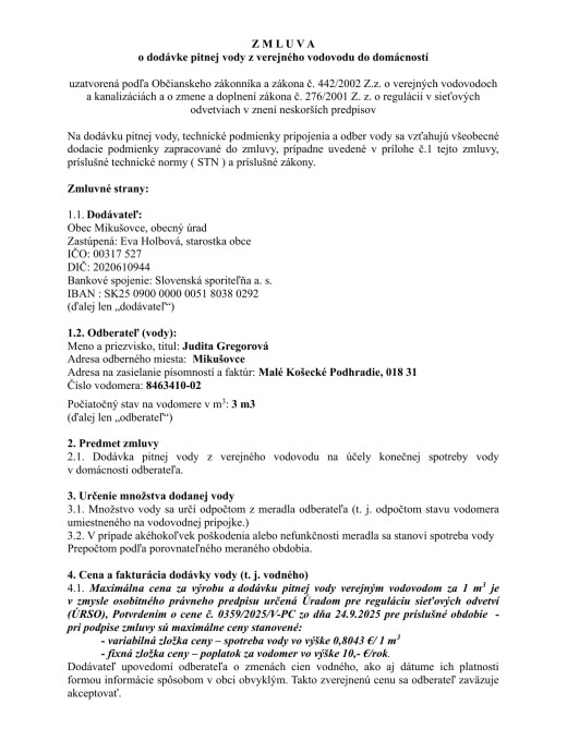 Zmluva o dodávke pitnej vody - Gregorová J.